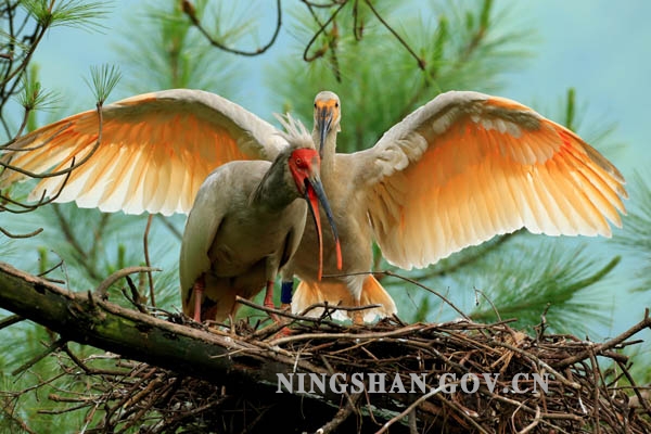 朱鹮出生两年后,开始谈恋爱,找到相爱的伴侣后,就开始寻找一个合适的地方安家,朱鹮只有在繁殖时才筑巢,巢一般都建在高大的松树、杨树上,从此后它们日夜厮守在一起,寻食、飞翔,彼此为对方梳理羽毛,亲亲热热,频频交配,产卵,雌鸟通常产2—4枚卵,雌雄鸟共同孵卵, 28天后孵化出小朱鹮,60天后离巢跟随父母自由飞翔。朱鹮是典型的一夫一妻的鸟类。一对朱鹮配成对后终生厮守在一起,双飞双宿,形影不离,共同承担抚育下一代的重任。